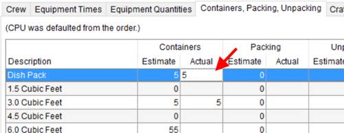 To update materials counts, open the Containers, Packing, and Unpacking tab, click in the Actual column corresponding to the entry you wish to update and enter the value.