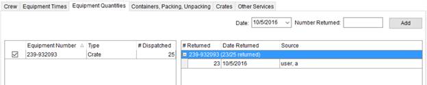 The Equipment Quantities tab, available through the Enter Actuals screen, allows you to identify the date the equipment was returned along with the quantity returned for billing.