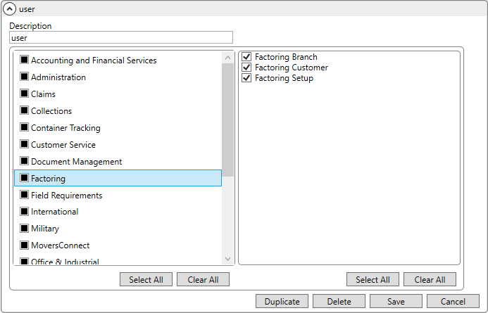 Use Security Profile Setup to assign personnel to access Factoring functionality within MoversSuite.