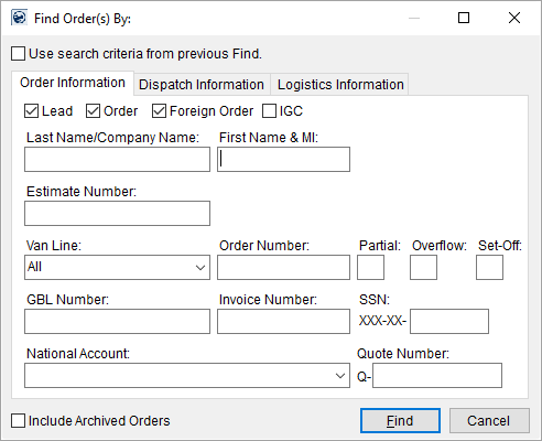 The Use search criteria from previous Find option appears in most Find dialogs. Checking this box recalls the search values of the last previous, successful search. This feature is module specific, therefore the Find recalls search values based on the which module you are in, i.e. the Find in Revenue Entry recalls different search values than the Find performed in Order Information.