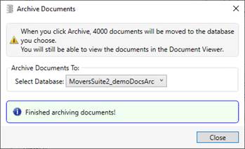 The Archive Documents prompt tells you the number of documents in total that you are about to archive. The ‘Select Database’ dropdown contains all the active databases so you can select one and click Archive.
