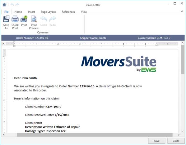When you run this report through various report options in MoversSuite, such through the Letters category on the Reports Menu, the application replaces the bookmark tags within the document with the data from the order.