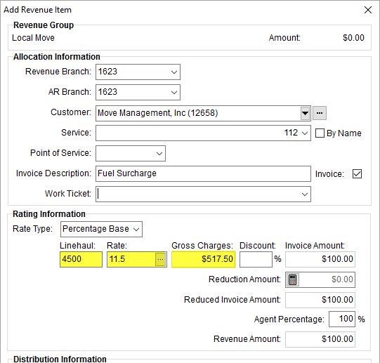 In the following example (Figure 15), a rate amount of 11.5% is applied to a linehaul amount of $4,500. From which, a $517.50 charge is computed based on 100-weight calculations.