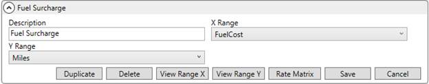 Create a Rate Matrix record within Rate Matrix Setup to retrieve a fuel surcharge percentage based on the current fuel prices. Set the X Range to Miles. Please note that order miles are not actually referenced for the lookup, however, the X Range is needed to support the Y Range of FuelCost.