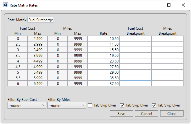 Once all fuel price tiers are established, save and close out of the screen, and the next step is to assign the fuel surcharge rate to each tier. Click on the Rate Matrix button and add Rate values for each price range. Enter a fuel surcharge percentage of 10.50% as 10.50 for the Rate, for example.