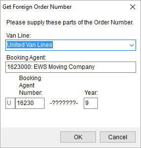 If do not have an order number, then you can request one be generated through the UniGroup International IBIL Interface and assigned to the order in MoversSuite through the Get Foreign Order Number function. You will be prompted to select a Van Line and specifiy Agent Number and Year to build your number and then send the request on to UniGroup International IBIL.