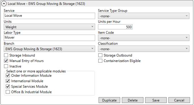MoversSuite Administration > Operations > Local Service Type