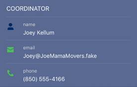 The Contacts screen is accessed through the CONTACTS tab on a Job screen. Click the three dots to open ASSIGNED CREW to see the listing of the crew assigned. View the Contact’s information as well as call, text, or email contact personnel from this screen. Address types include the ORIGIN ADDRESS, DESTINATION ADDRESS, CUSTOMER CONTACT, and ASSISTANCE contacts that include coordinator, sales person, dispatcher (person that cleared the service), and project manager on the order.