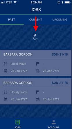 To perform the refresh, open the Jobs page and quickly tap and drag the screen down until you see the rotating, refresh icon. Once the refresh completes, the icon closes and the list is updated.