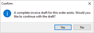 Choose Yes to open the draft within the New Complete Invoice screen. Choosing No, discards the draft and opens the New Complete Invoice screen.