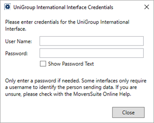 The User ID appears in the window title within MoversSuite. The User ID (Username) and Password are referenced within Login and the Change Password and dialogs. | |