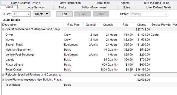 The Quotes System allows you to define any number of proposed charges for services, quickly and easily, from within any MoversSuite module. The Quote tab offers the ability to add and manage quotes associated to an order. Additionally, you can print and email generated quotes directly from this one tab. And, you can import accepted quotes into Revenue Entry as a standard revenue item or as third-arty payables.