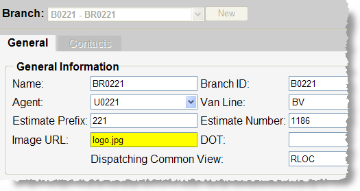 12. Press the TAB key through the remaining record values to keep the change made to the Image URL field. Note: The van line referenced for the imaging is that assigned to the branch. Refer to the MoversSuite Administration - web > Common > Branch Setup > Van Line field,