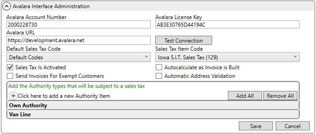 Establish an interface to Avalara through Avalara Interface Setup. Enter the information provided by Avalara to link to your specific account.