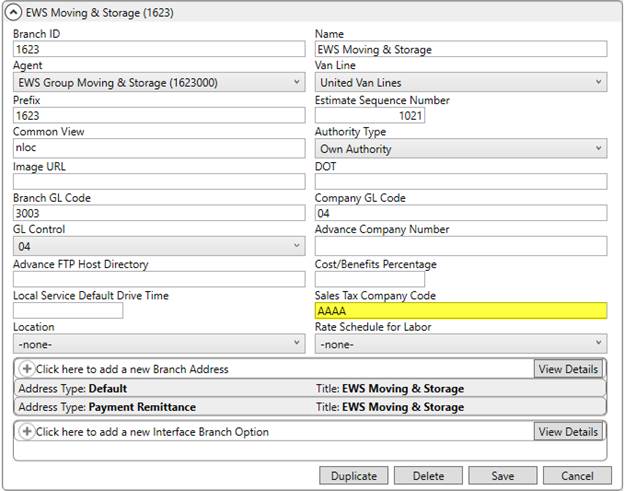 5. Update supported Branch Setup records with appropriate Sales Tax Company Code.