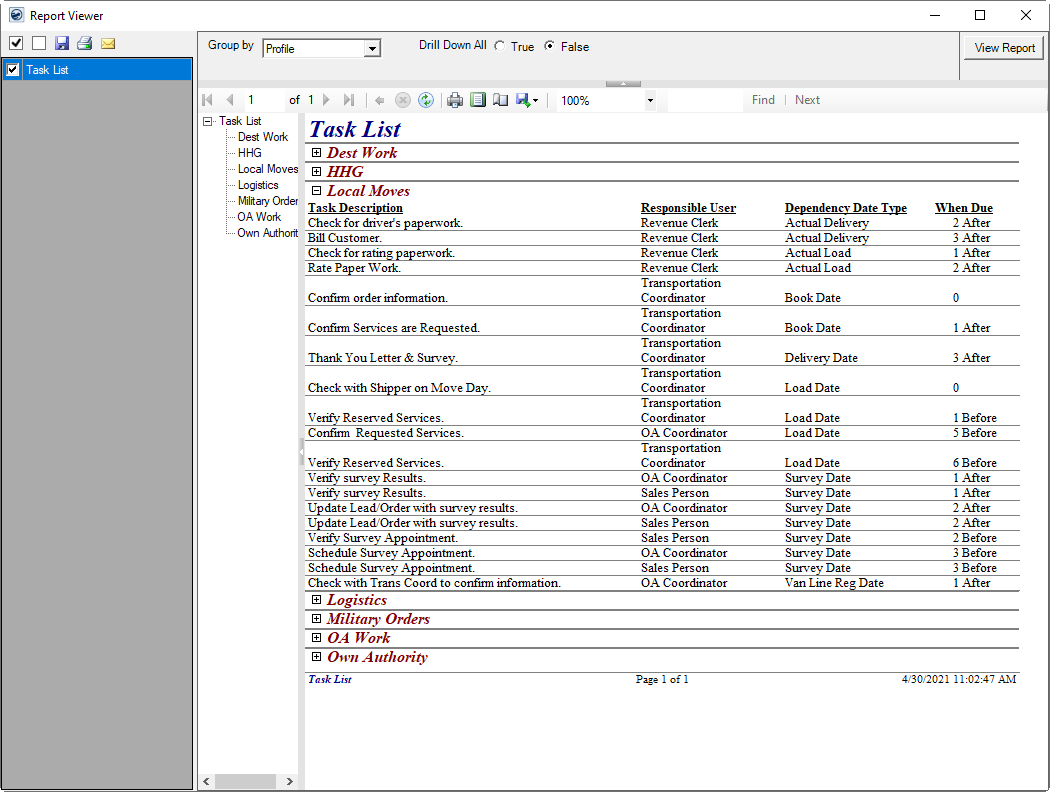 You can view the Task List report to see a list of Task Definitions grouped by Account Profile or by user responsible to perform the task.
