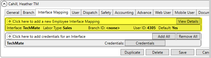 The User ID within the Add Employee Interface Mapping must match the Salesperson ID in TechMate.