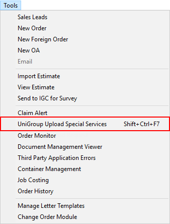 Order information outlined within the UniGroup Special Services Upload Contents topic is included in the send to UniGroup. The data set for the order also indicates whether the Tools Menu option is available.