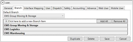 Control over functionality available to assigned branches is determined by the Security Profile assigned to the user. Set the Security Profile on the User tab accordingly.