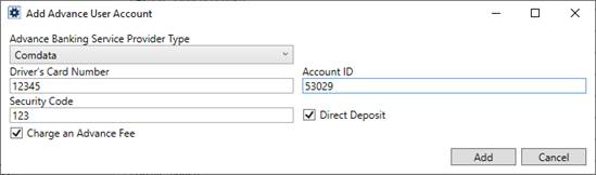 The Add Advance User Account screen dynamically changes between the two options. If you select Comdata from the Advance Banking Service Provider Type dropdown, the screen asks you to provide the following fields: