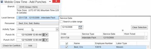 Use the Punch IN and Punch OUT scrollers to enter exact Punch In and Punch Out times. Use the ”Check for Conflicts” button to be sure that the Mobile Crew Time for a person assigned to a Local Service, is not being overlapped with any other service.