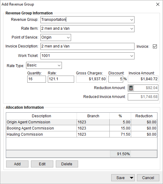 Revenue groups provide a way to combine related revenue items, create allocations, and provide an additional level of invoicing. The Add Revenue Group screen defines revenue for a group of transactions and sets forth allocations. You can access this screen through the Add Item > Revenue Group option and Edit Item of a group from within the Transactions tab.