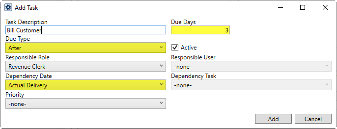 The Due Days and Due Type settings work in conjunction with the Dependency Date selection to determine the date the task is due. In the example below, the “Bill Customer” task will have a due date assigned to that is three days after the Actual Delivery date is set on the order. The application automatically sets the task due date when the Actual Delivery date.