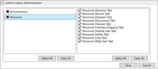 Personnel with an Admin Profile Setup record of “Super User” assigned to their user profiles can access this setup area for selecting the fields to be logged for Admin History. Choose and checkmark all the areas you want to log and press Save.