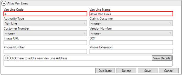Establish a Van Line Setup record for Atlas Van Lines with a Van Line Code of A. Enter other data as needed.