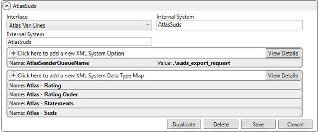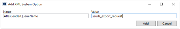 For Atlas SUDS Order Uploads, establish an XML System Option titled AtlasSenderQueueName with a Value containing the same path as that of the Request Queue within Queue Service Server Setup. Refer to Atlas SUDS XML Order Upload Setup.