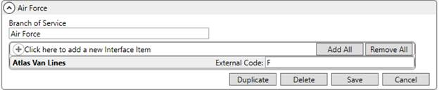 Use the Branch of Service Setup to map military service codes supported by Atlas to orders uploaded from MoversSuite.
