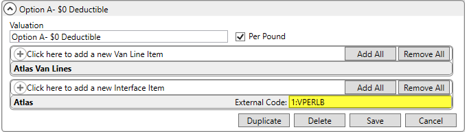 Define Valuation Setup records to support exchanging valuation information between MoversSuite and Atlas. The External Code is comprised of a Valuation Type followed by a colon and the Valuation Unit. The Valuation Unit are defined as follows: