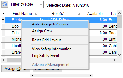 Dispatchers can auto assign crew through the Assign Crew grid in Local Dispatch. Dispatchers can double-click on an individual employee or select multiple crew members and choose the right-click option of Auto Assign to Service.