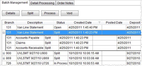 Opens the Split Statement screen where a user can divide the selected batch record.  A split is useful for dividing a batch into manageable pieces for detail processing and/or for grouping like transactions.