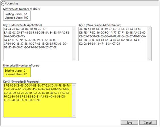 If you try to add a new user and the limit to your license count has been reached, this warning will appear at the bottom of the MoversSuite Administration > Reports >EnterpriseBI User Setupscreen.