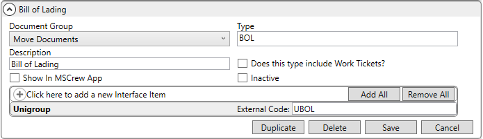 Additionally, define Interface Items to link a type to a supported interface, such as UniGroup. The External Code links a downloaded document to the record type and allows for auto uploading of the records. Refer to the Document Type (Auto-Upload) Setup in the next step.