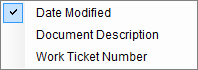 To update the sorting, right-mouse click on a document listing or category heading and select Sort Documents By, then select Date Modified, Document Description, or Work Ticket Number. The display will automatically reflect the selected sort option. The Sort Documents By option sorts all documents in all document groups. The Sort Documents By option is available when a user right-mouse clicks on a category heading.