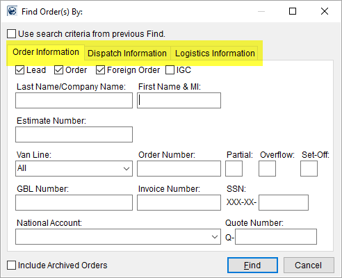 This section contains a listing of the search criteria options available by tab within the Find. The tabs that display within the Find depend on which MoversSuite module the user is accessing, therefore not all tabs will display at one time.