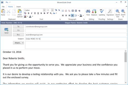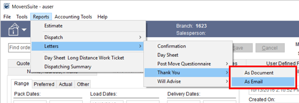 Choosing As Email opens the letter within a new MoversSuite Email window.