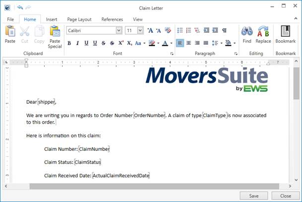 When you run this report through various report options in MoversSuite, such through the Letters category on the Reports Menu, the application replaces the bookmark tags within the document with the data from the order.
