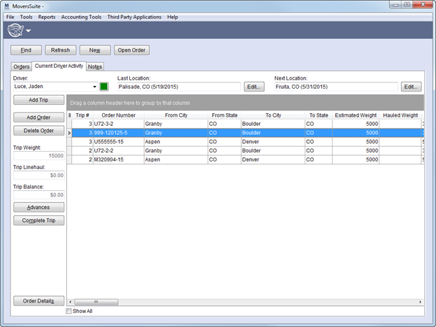 Current Driver Activity tab (Alt+V) Manage driver trip assignments and driver advances using the Current Driver Activity tab. | |
