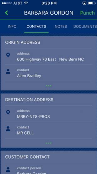 The title features the shipper name along with the ability to Punch into an activity for the job. In XX, the shipper name is Barbara Gordon.