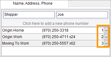 Select a phone type and enter the corresponding phone number for each contact phone number provided for the shipper. Phone types are defined with Shipper Phone Type Setup and affect several imports including those from Atlas, SIRVA, and UniGroup.