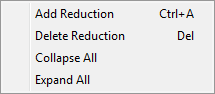 Add Reduction (Ctrl+A) This option opens a new reduction item within this screen. Delete Reduction (Delete) This option removes the selected reduction after prompting the user to confirm the request. Collapse All Close the display for all individual reduction records with this option. Expand All Open the display to view all reduction records with this option.