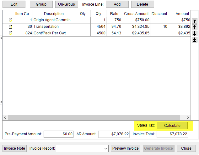 You can define the system to compute a sales tax automatically when line items are added, adjusted, or removed. Or you can define the system to require personnel to press a Calculate button (Figure 26) to pull in the sales tax amount from Avalara. Refer to Sales Tax Setup for more information.