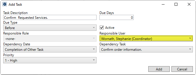 Next, build a list of Task items. These are the individual to-do items that comprise the workflow of personnel. The application computes a due date for the item as the number of Due Days before or after (based on the Due Type) of the Dependency Date. In the example below (Figure 17), a task of Confirm Requested Services shows up within the Tasks and Workflow grids with a due date that is five days before the Load Date set on the order. The task is assigned to the OA Coordinator set on the order, as well.
