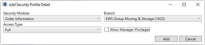 For example, if you wish someone to have full access to all Tasks functions for a branch within the Order Information module, then update their Security Profile Setup record to have the Branch with an Access Type of Full and verify that the branch is also in their assigned branches within the Branch tab of their Personnel Setup record.