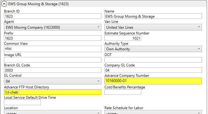 Setup area: MoversSuite Administration > Administration > Branch