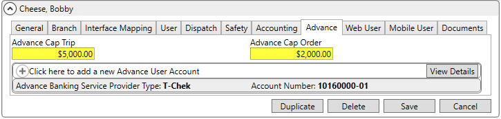 Also, if desired, set the Advance Cap Trip and Advance Cap Order values for the employee.