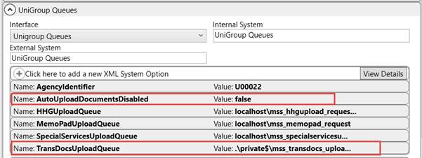 Queues.” Create two XML System Option records under the UniGroup Queues record: